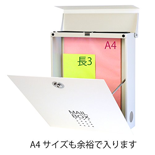 どんなイメージにも合わせやすい、四角い形のシンプルでおしゃれなポストです。 四角い形は何よりも物が入れやすく取り出しやすいのがいいところ。A4はもちろんのこともっと大きな角2サイズの封筒も入ります。(角2は多少歪みます) 普段はマグネットで開け閉め楽々、必要に応じて鍵をかけることもできます!