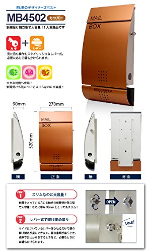 EUROデザイナーズポスト MB4502 レバータイプ鍵付き カッパー 新聞受け有 MB4502-KL-copper 4