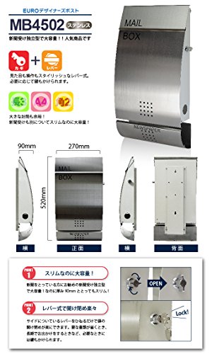 EUROデザイナーズポスト MB4502 レバータイプ鍵付き ステンレス 新聞受け有 郵便ポスト 郵便受け MB4502-KL-stainless 7