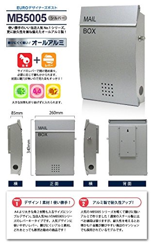郵便ポスト 郵便受け メールボックス 壁掛け EUROデザイナーズポスト MB5005 レバー開閉タイプ 鍵付き オールアルミ MB5005AA-KL-SILVER 32