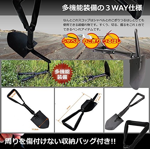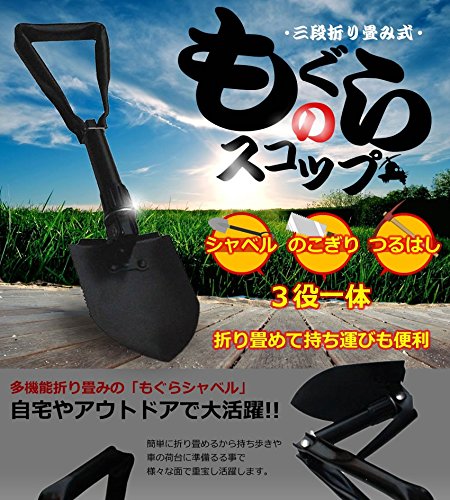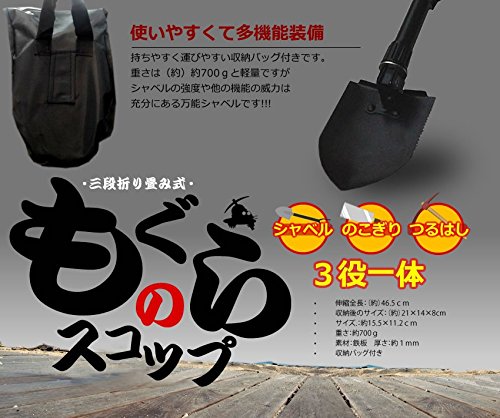 「シャベル」「 のこぎり」「 つるはし」が搭載された3役一体の折り畳み式「もぐらスコップ」の登場です!!!! 多機能で自宅やアウトドアで大活躍!! 折り畳めるから持ち歩きや車の荷台に簡単に積む事ができ様々な面で重宝し活躍します。 ●多機能装備の3WAY仕様 なんとこのスコップはシャベルとのこぎりつるはしとしても 使用できる超優れ物です。 すくう、切る、掘るをこれ1台でできる便利アイテムです。 ●周りを傷付けない収納バッグ付き!! 使いやすくて多機能装備 持ちやすく運びやすい収納バッグ付きです。 重さは(約)約700gと軽量ですがシャベルの強度や他の機能の威力は 充分にある万能シャベルです!!! 伸縮全長:(約)46.5cm 収納後のサイズ:(約)21×14×8cm サイズ.:約15.5×11.2cm 重さ:約700g 素材:鉄板 厚さ:約1mm 収納バッグ付き