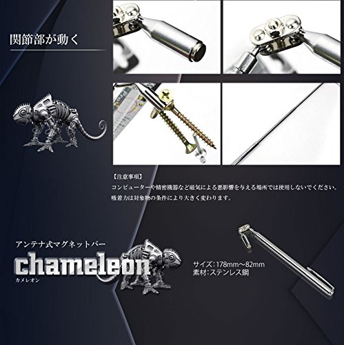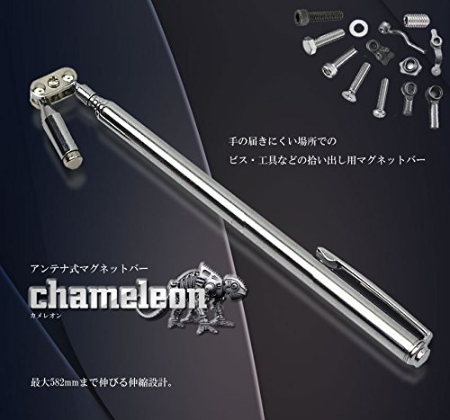 手の届きにくい場所でのビス・工具などの拾い出しに♪ マグネットバー「カメレオン」が登場です 最大582mmまで伸びる伸縮設計。 ・マグネット搭載 狭い場所でもマグネットで拾い出しが簡単です。 ・伸縮幅178mm-582mm ・吊り上げができます。携帯・保管・使用に便利なクリップ付です。 サイズ:178mm~82mm 素材:ステンレス鋼 ※注意事項※ コンピューターや精密機器など、磁気によって悪影響を与える 可能性のある場所では使用しないでください。 吸着力は対象物の条件により大きく変わります。 ※輸入商品のため小傷や汚れ等ある場合がございます。