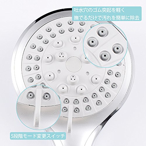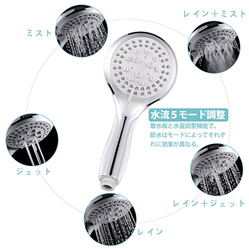 - 5段階モード調整可能:シャワーヘッドの散水板にあるボタンを軽く回したら、五つの吐水モードを切り替える可能です。「ミスト」、「レイン+ミスト」、「ジェット」、「レイン+ジェット」、「レイン」からお好きなモードをお選びください。