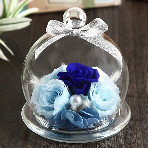 プリザーブドフラワーはホコリが苦手ですが、ガラスポットが守ってくれるので、長い間お花本来の風合いを保ち、色あせることなく輝きます。