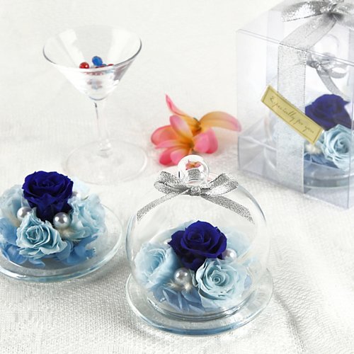 - 2~3cmのロイヤルブルーのバラ1輪、スカイブルーのバラ4輪、紫陽花、猫じゃらし、パールビーズでアレンジしたガラスドームアレンジ。ガラスポットの中にお花がいっぱい詰め込まれているTEATSIGHTオリジナルのアレンジです。