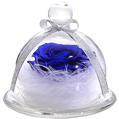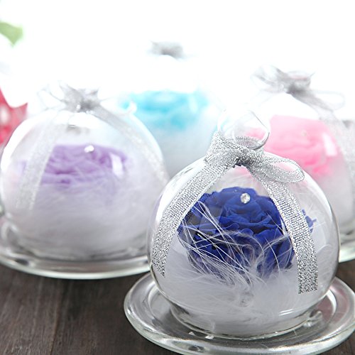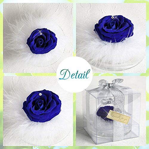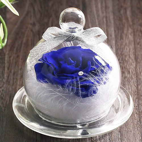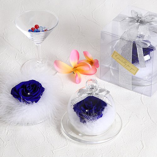 - 5~6cmのロイヤルブルーの薔薇の花びらにスワロフスキー社製クリスタルを1粒付けフワフワな真っ白な羽根で包みこみました。小さめのガラスポットの中に大きなお花とフワフワな羽根が詰め込まれているTEATSIGHTオリジナルのアレンジです。