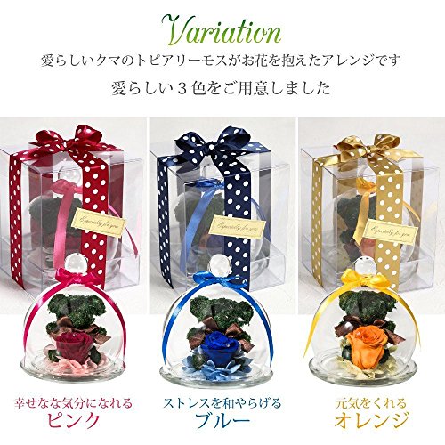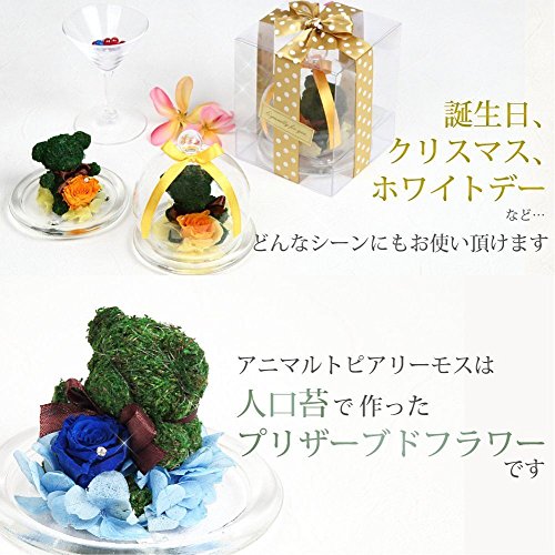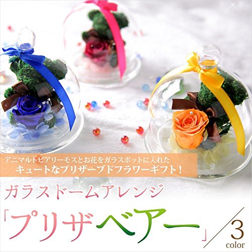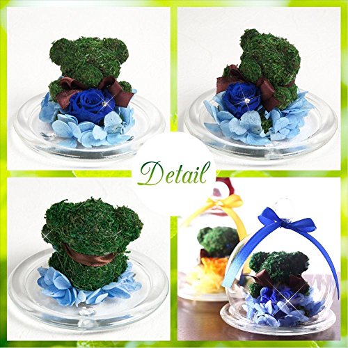 ●ガラスポット入りプリザーブドフラワー●プリザーブドフラワーとはプリザーブドフラワーは造花とは違い、生花に特殊な加工を施した枯れないお花。生花を加工するので、柔らかな質感、鮮やかな色合い・雰囲気を長い間お楽しみいただけ、プレゼントにもぴったり。●アレンジ透明のガラスポットにバラとトピアリーモスでアレンジしたプリザーブドフラワー。緑のクマがバラの花を大切に抱えている。プリザーブドフラワーはホコリが苦手だが、ガラスポットが守ってくれるので、長い間お花本来の風合いを保ち、色あせることなく輝きる。アレンジは台座に固定されているので花が潰れる心配がなく、いつまでも綺麗な状態で飾っていただけます。●商品詳細・品名:プリザーブドフラワー・花:バラ1輪,ベア―トピアリーモス1体,アジサイ・花言葉:神の祝福・奇跡・夢かなう・サイズ(ガラスケース):約φ9×10cm 台座:φ10cm 高さ:11cm・トピアリーモス:高さ6cm前後