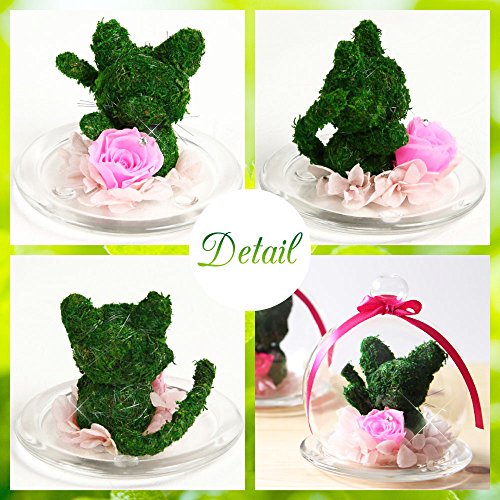 - スワロフスキー社製ラインストーンが花びらについた2~3cmのパステルピンクのバラ1輪、かわいい猫のトピアリーモス、紫陽花でアレンジしたガラスドームアレンジ。ガラスポットの中にかわいい動物がお花を抱えたTEATSIGHTオリジナルのアレンジです。