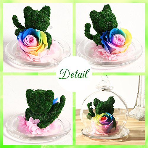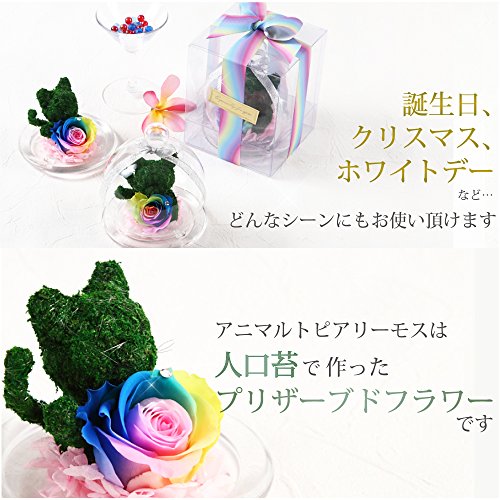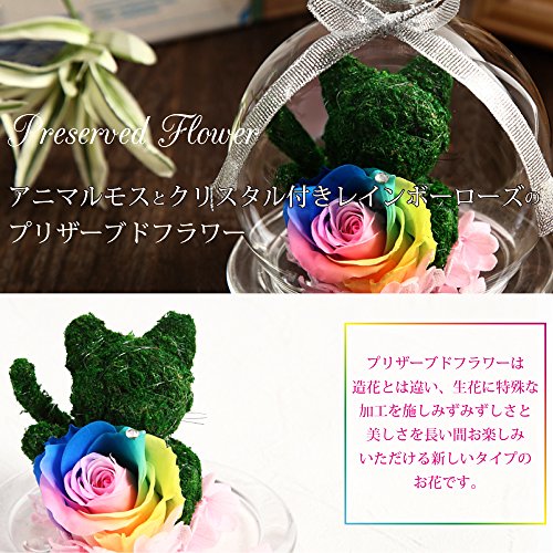 TEATSIGHT プリザーブドフラワー アニマルモス ガラスポット入り フラワーアレンジ ラッピング済み ( 猫 レインボーローズ )