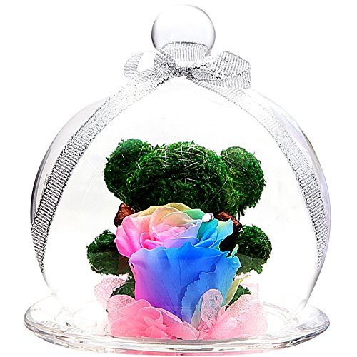 透明のガラスポットにスワロフスキー社製クリスタルが付いたレインボーローズとクマの形のトピアリーモスでアレンジしたプリザーブドフラワー。