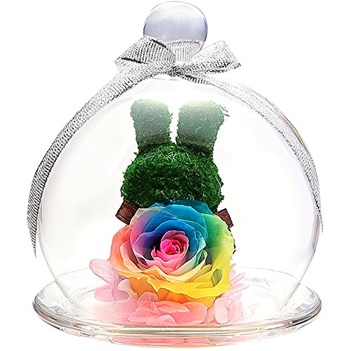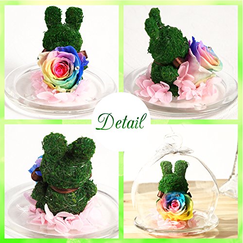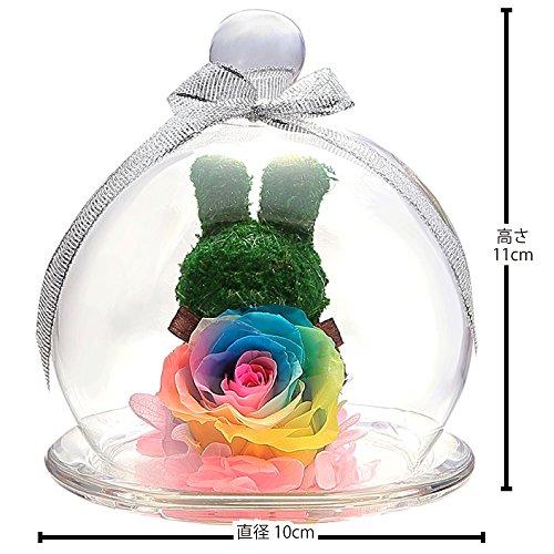 - スワロフスキー社製ラインストーンが花びらについた2~3cmのレインボーローズ1輪、可愛いうさぎのトピアリーモス、紫陽花でアレンジしたガラスドームアレンジ。ガラスポットの中にかわいい動物がお花を抱えたTEATSIGHTオリジナルのアレンジです。