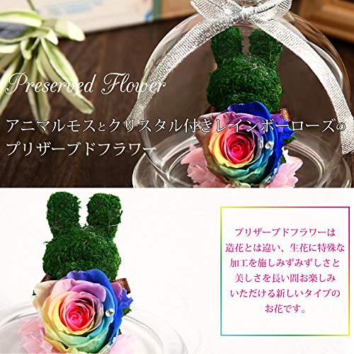 透明のガラスポットにスワロフスキー社製クリスタルが付いたレインボーローズとうさぎの形のトピアリーモスでアレンジしたプリザーブドフラワー。