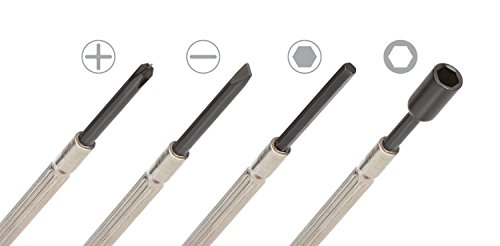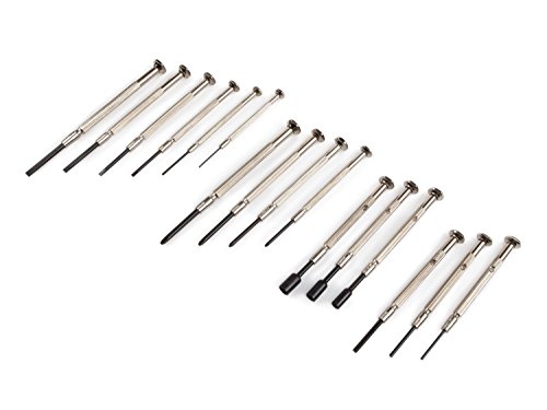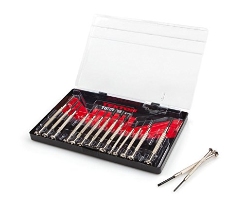 The TEKTON Precision Screwdriver Set features hardened carbon steel shafts with a durable black oxide finish. The chrome plated alloy steel handles have free-turning end caps that allow constant finger pressure while driving. Nonslip knurled handles provide fingertip control. The hex and nut drivers have a hole in handle for leverage bar-assisted torque.Set Includes:(6) Flat: 1, 1.4, 2, 2.4, 3, 3.8 mm(4) Phillips: #0-2, #0, #1-2, #1-1(3) Hex: 1.5, 2, 2.5 mm(3) Nut Drivers: 3, 4, 5 mm(1) Organizer case