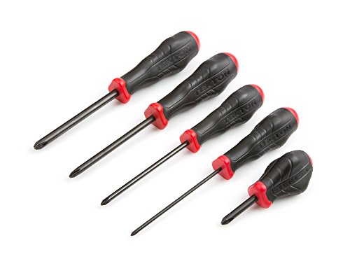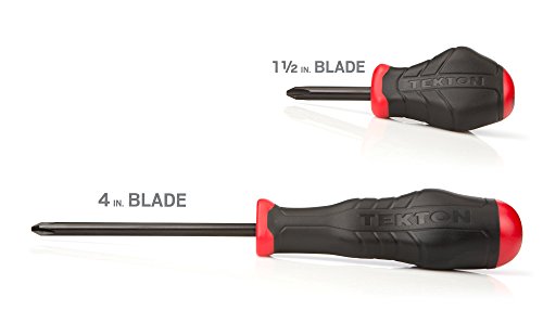 With unique three-sided handles, the TEKTON 5-pc. Phillips Screwdriver Set gives you the leverage to generate more torque. Both the full- and stubby-length handles offer real mechanical advantage, not the friction against your skin, to break loose stubborn fasteners. Full-length handles also have rounded top and bottom sections that let your fingertips spin long fasteners quickly. Making the most of awkward hand positions when you have limited room, the compact stubby-length handle gives you extra control to turn and tighten fasteners. All the blades are made of premium chrome molybdenum steel and are strengthened through an exacting heat treating process. Rather than a layer of plating, the steel surface of the blades is directly treated with a hot black oxide finish—the same process used to protect firearms. This finish can't flake off, and it preserves the precisely sized tips for an exact fit in fasteners over time. The butt ends have a clear size marking that is easy to identify in your tool belt or chest drawer.