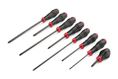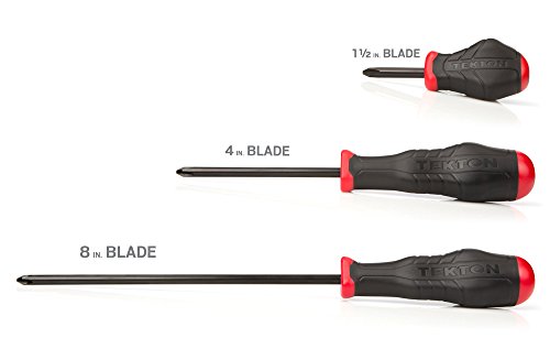 With unique three-sided handles, the TEKTON 8-pc. Phillips Screwdriver Set gives you the leverage to generate more torque. Both the full- and stubby-length handles offer real mechanical advantage, not the friction against your skin, to break loose stubborn fasteners. Full-length handles also have rounded top and bottom sections that let your fingertips spin long fasteners quickly. Making the most of awkward hand positions when you have limited room, the compact stubby-length handle gives you extra control to turn and tighten fasteners. All the blades are made of premium chrome molybdenum steel and are strengthened through an exacting heat treating process. Rather than a layer of plating, the steel surface of the blades is directly treated with a hot black oxide finish—the same process used to protect firearms. This finish can't flake off, and it preserves the precisely sized tips for an exact fit in fasteners over time. The butt ends have a clear size marking that is easy to identify in your tool belt or chest drawer.