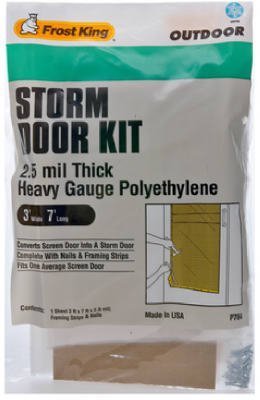 3' x 7', 2.5 mil exterior storm door cover, with fiber framing strips & nails. This product adds a great value. Product is highly durable and very easy to use. This product is manufactured in china.