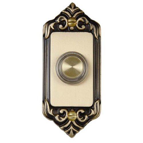 ソリッドの真鍮、ドアチャイム、プッシュ・ボタンにLED照明リム,ソリッド真鍮アンティーク仕上げ盾と飾り彫刻デザイン、7 / 8 " L x 1 – 3 / 8 " W x 3 – 1 / 4 " H ,フラッシュマウント固定型ドアチャイムボタンをクリックし、for use with wired chimes , bells &ブザー、8 V~24 V , Clam Shell Pack。