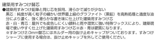 ●【用途】建築用すみつけシャープペン替芯。【特徴・機能】建築用すみつけ鉛筆と同じ芯を採用、滑らかで減りが少ない。屋外でも変色しにくい顔料と雨や湿気に強い特殊ワックスにより、建築現場で使いやすく仕上げた建築用すみつけ芯です。硬質芯です。