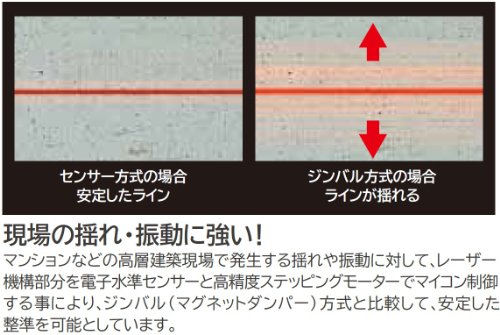 ●【用途】基準出し用レーザー墨出し器。●【機能・特長】センサー機能で揺れに強いです。明るい場所でも見やすい高輝度レーザーです。精密な地墨合わせができる360度回転微調整機能付です。本体に直接三脚の取り付けができます。●【材質】外装:ABS樹脂。【注意事項】●【重要】ご購入された際には、必ずご登録を行ってください、保証書にはご使用される方の名前のご記入が必要です。●製品ついてのお問い合わせは、タジマレーザー相談デスクまで:0120-933297(受付時間:月曜日~金曜日 9:00~17:30※12:00~13:00/祝日・メーカー指定休日を除く)。●使用前使用後に必ず精度確認を行って下さい。