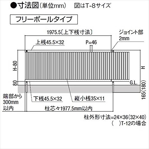 ●フリーポールと本体連結部、および端部との距離は300mm以内で施工して下さい。それ以上離れると強度が低下します。