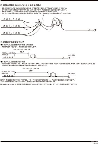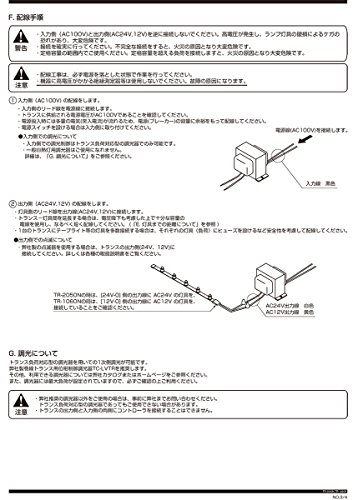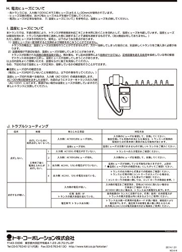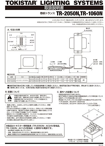 メーカー: TOKI CORPORATION (TOKISTAR)/ トキ・コーポレーション(トキスター) シリーズ名:巻線トランス 定格入力:AC100V 50Hz/60Hz 定格出力:AC24V 50W 重量:約1.5kg 絶縁種別:A種絶縁トランス 屋内用別置型 電流ヒューズまたはブレーカー付 溶断型温度ヒューズ内蔵 ■本電源について 本製品はトキスター照明器具に使用する電源です。他の器具には使用しないでください。 分解、改造は行わないでください。製品保証対象外となります。 機器に高電圧がかかる絶縁測定器等は使用しないでください。故障の原因となります。 ■設置について 本製品は屋内仕様です。水のかかる所、湿気が多く 結露する所、油煙のあたる所には設置しないでください。 周囲温度が高くなりますので、トランスを重ねたり、密集させて設置しないでください。 風通しが良く、土台のしっかりした場所に設置してください。(周囲温度-5~40℃) できるだけ灯具の近くに設置してください。灯具とトランス間の距離が離れる場合は、電圧降下を考慮し容量の大きい電線で接続してください。 複数のトランスを設置する場合や、コントローラと組み合わせて使用する場合には放熱を配慮して設置してください。 配線工事は、必ず工事店又は有資格者に依頼してください。(一般の方の電気工事は法律で禁止されています。) ■屋外への設置について 本製品は屋外対応ではありません。 屋外で使用される場合は市販の熱機器収納ボックスやTOKISTAR製トランス収納ボックスが別途必要となります。 TOKISTAR製トランスボックス1台に収納できる台数は以下のとおりです。 *TR-2050N、またはTR-1060N 6台 *TR-2050N、またはTR-1060N 3台+コントローラ3台(TC-L28Cを除く) 推奨負荷範囲を下まわる負荷容量で使用した場合、出力電圧の変動によりランプ寿命が短くなる場合があります。 音響機器やアンテナ等の近くには設置しないでください。 最大負荷時や調光時には、小さなうなり音がする場合がありますが、機器の異常や故障ではありません。 関連キーワード 電源 トランス 変圧
