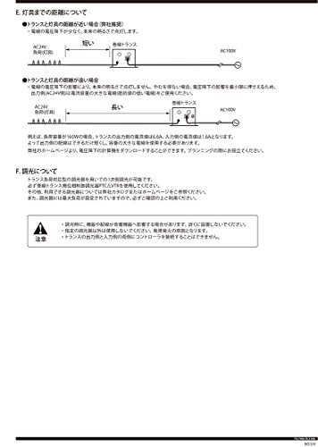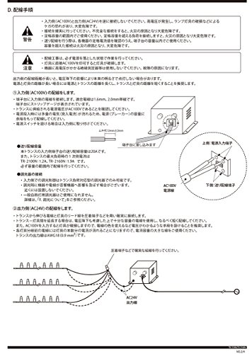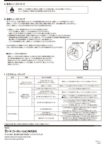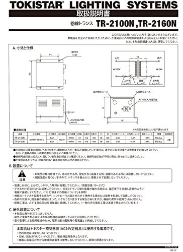 メーカー: TOKI CORPORATION (TOKISTAR)/ トキ・コーポレーション(トキスター) シリーズ名:巻線トランス 定格入力:AC100V 50Hz/60Hz 定格出力:AC24V 100W 重量:約2.5kg 絶縁種別:A種絶縁トランス 屋内用別置型 電流ヒューズまたはブレーカー付 溶断型温度ヒューズ内蔵 ■本電源について 本製品はトキスター照明器具に使用する電源です。他の器具には使用しないでください。 分解、改造は行わないでください。製品保証対象外となります。 機器に高電圧がかかる絶縁測定器等は使用しないでください。故障の原因となります。 ■設置について 本製品は屋内仕様です。水のかかる所、湿気が多く 結露する所、油煙のあたる所には設置しないでください。 周囲温度が高くなりますので、トランスを重ねたり、密集させて設置しないでください。 風通しが良く、土台のしっかりした場所に設置してください。(周囲温度-5~40℃) できるだけ灯具の近くに設置してください。灯具とトランス間の距離が離れる場合は、電圧降下を考慮し容量の大きい電線で接続してください。 複数のトランスを設置する場合や、コントローラと組み合わせて使用する場合には放熱を配慮して設置してください。 配線工事は、必ず工事店又は有資格者に依頼してください。(一般の方の電気工事は法律で禁止されています。) ■屋外への設置について 本製品は屋外対応ではありません。 屋外で使用される場合は市販の熱機器収納ボックスなどに収納してください。 推奨負荷範囲を下まわる負荷容量で使用した場合、出力電圧の変動によりランプ寿命が短くなる場合があります。 音響機器やアンテナ等の近くには設置しないでください。 最大負荷時や調光時には、小さなうなり音がする場合がありますが、機器の異常や故障ではありません。 関連キーワード 電源 トランス 変圧