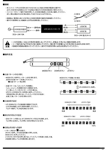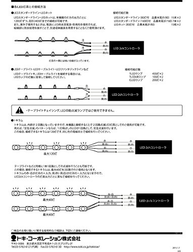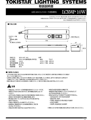 メーカー: TOKI CORPORATION (TOKISTAR)/ トキ・コーポレーション(トキスター) シリーズ名:LED 2chコントローラ(防雨形) 定格入力:DC6-24V 10A 出力電圧:DC6-24V 出力電流:5A×2 使用温度範囲:0-40℃ 製品重量:約250g 保護等級:IP54 ■注意 本製品は、トキスターLED照明器具専用のコントローラです。 故障などの恐れがありますので、他の機器は使用しないでください。 点灯させるLED器具に指定のLED直流電源をご使用ください。直接AC100Vを接続すると機器が破損します。 TOKISTAR製LED用トランスDTR-032-08、DTR-080-08では使用できません。 作業は、電源を切った状態で行ってください。 結線後は、絶縁抵抗計による絶縁試験など、高圧をかけないでください。 本製品を分解・改造することはおやめください。 本製品は屋外設置対応機器です。結線部は市販の結線ボックスに入れるなどして必ず防水処理を施してください。 本製品は次のような環境下では使用できません。 ・ 周囲温度が0~40℃を超える場所 ・ 振動が多い場所 ・ 可燃性・腐食性ガス等が発生する場所 ・ 水没する場所 ・ 浴室等、高温高湿となる場所 関連キーワード コントローラー