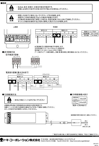 メーカー: TOKI CORPORATION (TOKISTAR)/ トキ・コーポレーション(トキスター) シリーズ名:LED用定電流電源 PWM信号タイプ 定格入力:AC100V/AC200V/AC242V 50Hz/60Hz 39VA 定格出力:700mA定電流 11-47V 重量:340g 対応信号:インバータ蛍光灯用PWM信号(DC10-12V 1kHz) ■本電源について TOKISTAR 「LED照明器具」専用の電源です。他の器具には使用しないでください。 分解、改造は行わないでください。製品保証対象外となります。 配線した後は、高圧のかかる絶縁測定器などで絶縁チェックを行わないでください。 本製品についた汚れは、中性洗剤を軽く含ませた柔らかい布で拭いてください。 通電したままで工事はしないでください。灯具が破損します。 本製品は接地工事が必要です。D種(第3種)接地工事を確実におこなってください。接地工事をしないと感電の原因となります。 ■設置について 周囲温度が高くなりますので、電源を重ねたり、密集して設置しないでください。 使用周囲温度は0~40℃です。 風通しがよく土台のしっかりした場所に設置してください。 複数の電源を設置する場合や、コントローラと組み合わせて使用する場合には放熱を配慮して設置してください。 電源ユニットは横転、逆転しないように施工してください。 音響線、アンテナ線、アース線(本電源ユニットのアース線は除く)等から1m以上離してください。 2台以上並べて設置する場合は、電源ユニットの幅以上に離して通風に注意してください。 照明器具本体より10cm以上離してください。 本体と付属ユニットは外さないでください。 配線工事は、必ず工事店又は有資格者に依頼してください。(一般の方の電気工事は法律で禁止されています。) 関連キーワード LED 電源 トランス 変圧