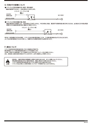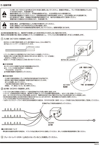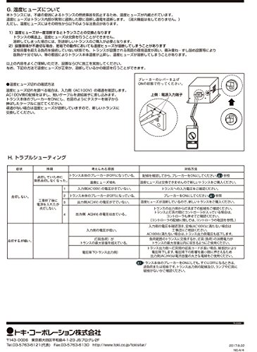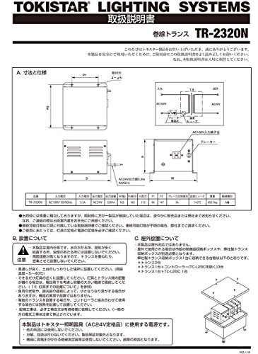 メーカー: TOKI CORPORATION (TOKISTAR)/ トキ・コーポレーション(トキスター) シリーズ名:巻線トランス 定格入力:AC100V 50Hz/60Hz 定格出力:AC24V 320W 重量:約5.5kg 絶縁種別:A種絶縁トランス 屋内用別置型 電流ヒューズまたはブレーカー付 溶断型温度ヒューズ内蔵 ■本電源について 本製品はトキスター照明器具に使用する電源です。他の器具には使用しないでください。 分解、改造は行わないでください。製品保証対象外となります。 機器に高電圧がかかる絶縁測定器等は使用しないでください。故障の原因となります。 ■設置について 本製品は屋内仕様です。水のかかる所、湿気が多く 結露する所、油煙のあたる所には設置しないでください。 周囲温度が高くなりますので、トランスを重ねたり、密集させて設置しないでください。 風通しが良く、土台のしっかりした場所に設置してください。(周囲温度-5~40℃) できるだけ灯具の近くに設置してください。灯具とトランス間の距離が離れる場合は、電圧降下を考慮し容量の大きい電線で接続してください。 負荷の状態や、調光器の接続によって、小さなうなり音がする場合がありますが、機器の異常や故障ではありません。 複数のトランスを設置する場合や、コントローラと組み合わせて使用する場合には放熱を配慮して設置してください。 配線工事は、必ず工事店又は有資格者に依頼してください。(一般の方の電気工事は法律で禁止されています。) ■屋外への設置について 本製品は屋外対応ではありません。 屋外で使用される場合は市販の熱機器収納ボックスやTOKISTAR製トランス収納ボックスが別途必要となります。 TOKISTAR製トランスボックス1台に収納できる台数は以下のとおりです。 *トランス2台 *トランス1台+コントローラー(TC-L28Cを除く)3台 *トランス1台+TC-L28C 1台 推奨負荷範囲を下まわる負荷容量で使用した場合、出力電圧の変動によりランプ寿命が短くなる場合があります。 音響機器やアンテナ等の近くには設置しないでください。 最大負荷時や調光時には、小さなうなり音がする場合がありますが、機器の異常や故障ではありません。 関連キーワード 電源 トランス 変圧