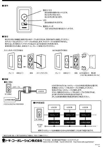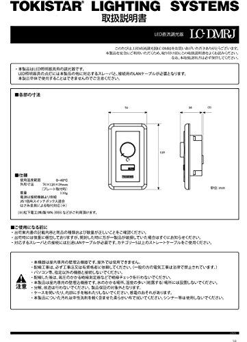 メーカー: TOKI CORPORATION (TOKISTAR)/ トキ・コーポレーション(トキスター) シリーズ名:LED直流調光器 使用温度範囲:0-40℃ 外形寸法:70 ×120× 38mm(プレート取付時) 重量:110g 電源は接続機器より供給 JIS1個用スイッチボックス適合 はさみ金具による取付対応(※) (※)パナソニック製WN-3993などがご利用頂けます。 本製品はLED照明器具用の調光器です。 LED照明器具の点灯には本製品の他に対応するスレーバと、接続用のLANケーブルが必要となります。 本製品単体で使用することはできませんのでご注意ください。 ■注意 本機器は屋内専用の壁埋込機器です。屋外では使用できません。 配線工事は、必ず工事店又は有資格者に依頼してください。(一般の方の電気工事は法律で禁止されています。) パソコン等、指定以外の機器と接続しないでください。 配線した後は、高圧のかかる絶縁測定器などで絶縁チェックを行わないでください。 本製品は屋内専用の壁埋込機器です。水のかかる場所、湿度の多い(結露する)場所には設置しないでください。 分解、改造は行わないでください。 製品保証の対象外となります。 ケースを開いたり、内部に手を触れたりしないでください。感電のおそれがあります。 本製品についた汚れは中性洗剤を軽く含ませた柔らかい布で拭いてください。シンナー等は使用しないでください 関連キーワード コントローラー 調光
