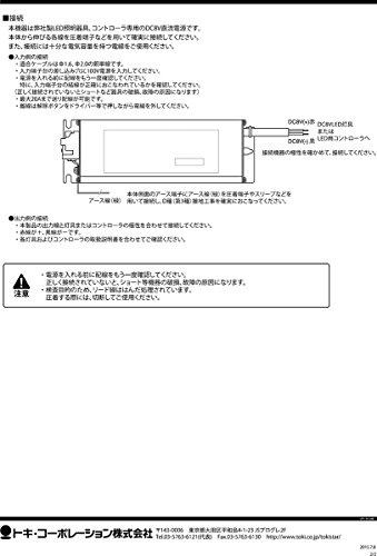 メーカー: TOKI CORPORATION (TOKISTAR)/ トキ・コーポレーション(トキスター) シリーズ名:LED用直流電源 入力定格:AC100V 50Hz/60Hz 100VA 出力電圧:DC8V 出力電流:5A 重量:450g ■本電源について 本機器はTOKISTAR製LED照明器具、コントローラ専用のDC8V直流電源です。 分解、改造は行わないでください。製品保証対象外となります。 配線した後は、高圧のかかる絶縁測定器などで絶縁チェックを行わないでください。 本製品についた汚れは、中性洗剤を軽く含ませた柔らかい布で拭いてください。 接続可能灯数は、灯具に付属している取扱説明書でご確認ください。 本製品は接地工事が必要です。D種(第3種)接地工事を確実に行ってください。接地工事をしないと感電の原因となります。 ■設置について 本製品は屋内用です。水のかかるところ、湿気が多く結露するところ、油煙の当たるところには設置しないでください。 周囲温度が高くなりますので、電源を重ねたり、密集して設置しないでください。 風通しがよく土台のしっかりした場所に設置してください。 複数の電源を設置する場合や、コントローラと組み合わせて使用する場合には放熱を配慮して設置してください。 高温多湿をさけ、操作しやすい場所を選んで設置してください。 音響機器やアンテナ等の近くには設置しないでください。 最大負荷時や調光時には、30dB未満の小さなうなり音がする場合がありますが、機器の異常や故障ではありません。 位相制御調光器による制御には対応していません。 関連キーワード LED 電源 トランス 変圧