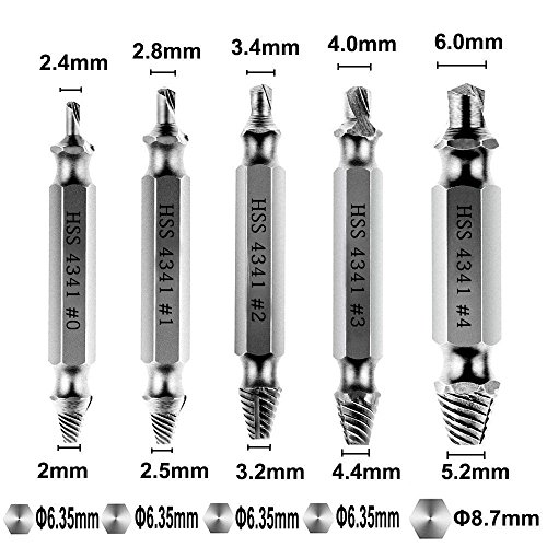 - 5ピーススクリューエクストラクタセットは、ドリルとスクリューサイズまたはボルトで動作します。 H.S.S.製 4341#、硬度は62-63HRCです。剥ぎ取った、壊れた、固着した、または損傷したねじの取り外しには十分です。