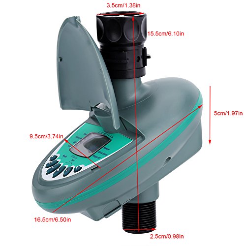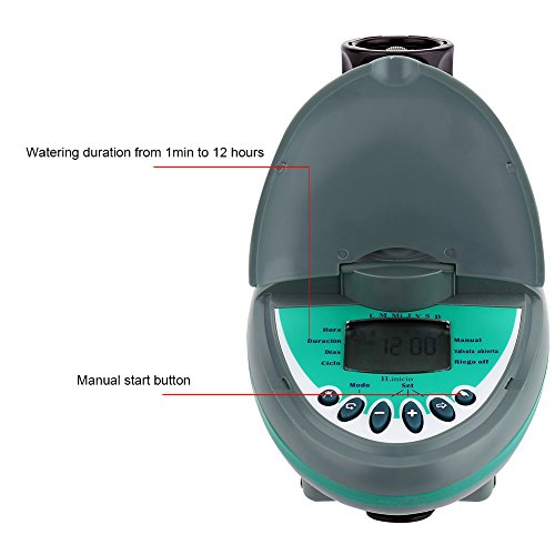 クリアLCDディスプレイと防水カバー付き。毎日給水モード/ユーザー定義の給水モード。散水時間は1分から12時間まで設定できます。 1日あたり最大4つの開始時間、使用しないときはOFFに設定します。手動ボタンでは、突然手動操作が可能です。 1つの9Vアルカリ乾電池、低エネルギー消費が必要で、毎年バッテリーを交換してください。落下灌漑システムに適して、それは垂直に外に設置することができます。