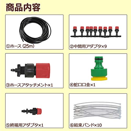 - 【25Mの場合】1×25Mホース(外径:7mm、内径:4mm)1×蛇口コネクタアクセサリー1×蛇口29×ティージョイント30×調節可能なドリッパー30×固定ステム。【15Mの場合】1×15Mホース(外径:7mm、内径:4mm)1×蛇口コネクタアクセサリー1×蛇口19 xティージョイント20×調節可能なドリッパー20×固定ステム【5Mの場合】1×5Mホース(外径:7mm、内径:4mm)1×蛇口コネクタアクセサリー1×蛇口9×ティージョイント10×調節可能なドリッパー10×固定ステム