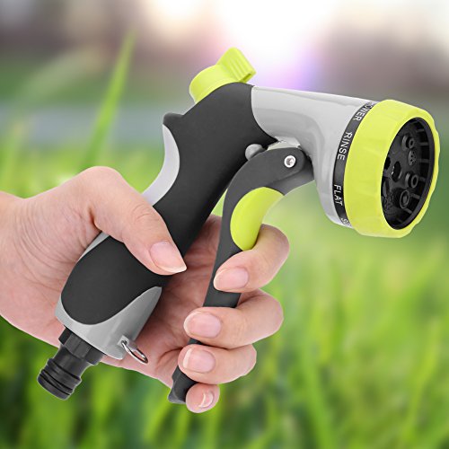 8つの水出口パターン:シャワー、センター、ジェット、泡立て器、コーン、ミスト、フラットおよびリンス。亜鉛合金本体は丈夫で長持ちしています。人間工学的トリガーはグリップとノンスリップに快適です。ハンズフリークリップでハンドルを固定するので、それを絶えず押す必要がなくなり、労力を節約できます。ウォーターホースとの接続が容易で、水を制御するスイッチ付き。