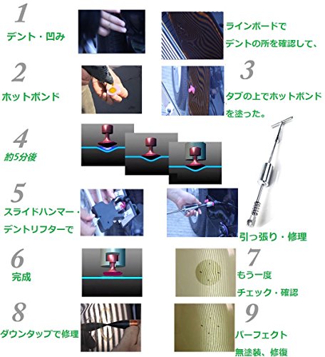 - 使用説明:1、凹みを探し出します。 2、自動車ボディの凹み部分を綺麗に拭います。 3、グル―ガンでホットボンドを溶かして、凹みとタブの上で溶かしたホットメルト接着剤スティックを塗って、タブの先端を凹みの中央にしっかりして貼り付けて5分~10分間に乾燥させます。 4、タブの後端をデントリフター(或いはほかの引っ張り工具)修理工具に差し込んで、タブを徐々に引っ張りします。 5、凹みのところは平らになったら、修復することが完成します。 タブを抜きまして、アルコール(特殊剤で)で乾いたボンドを剥がします。6、修理の表面をクリーンに拭いてください。 もし不規則な小さい凹み(dent)があれば、ペン型の棒(tap down)をナラシハンマー(Hail hammer)で叩いて修理することができます。