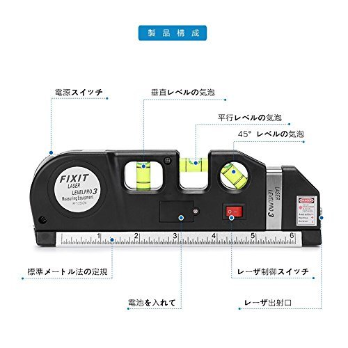 - 3つのレーザーライン(垂直線、✖線、平行線)は色々な希望をご満足できます。3つの気泡の角度は平行と垂直の位置を調節することができます。