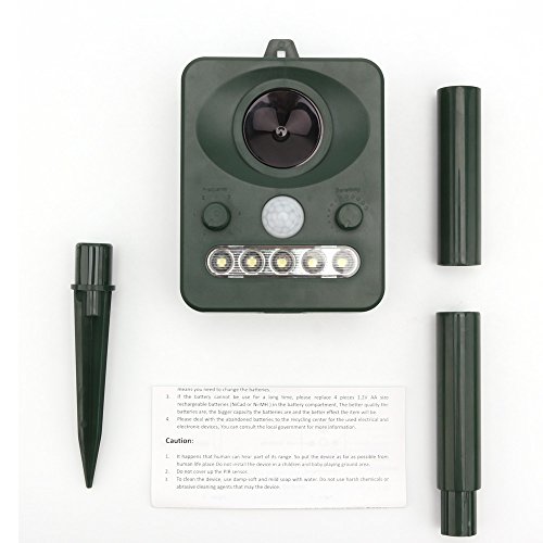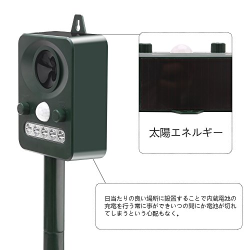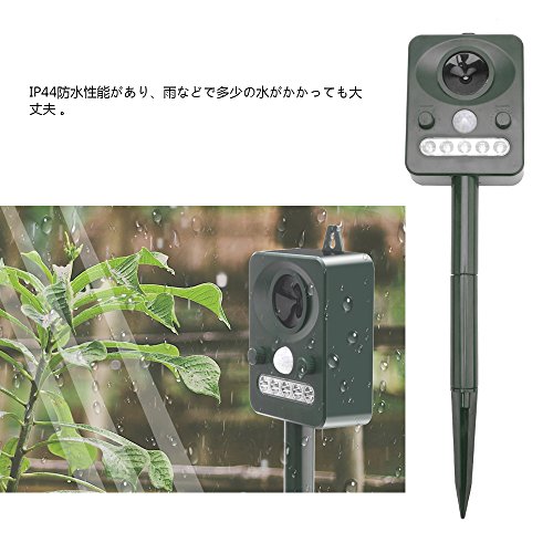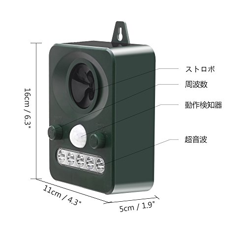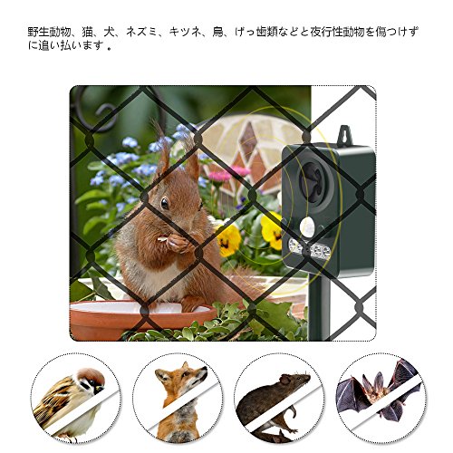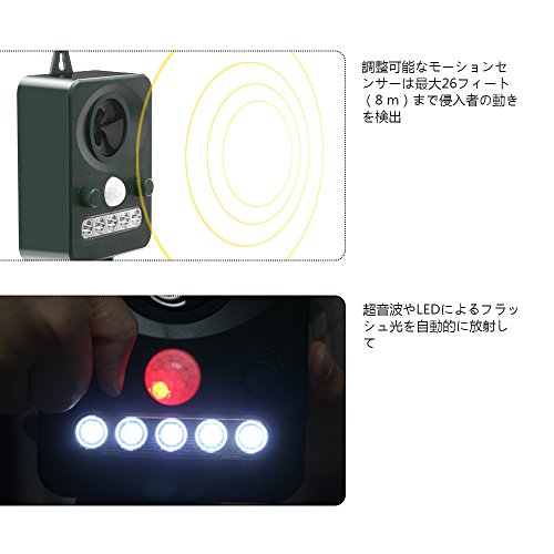 - 調整可能なモーションセンサーは最大26フィート(8 m)まで侵入者の動きを検出し,嫌がる周波数帯の超音波やLEDによるフラッシュ光を自動的に放射して,野生動物、猫、犬、ネズミ、キツネ、鳥、げっ歯類などと夜行性動物を傷つけずに追い払います 。
