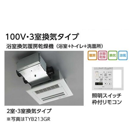 ★[TYB213GAR]TOTO 浴室換気暖房乾燥機 三乾王 ビルトインタイプ(天井埋め込み) 集合住宅向け 100V・3室換気タイプ(浴室+トイレ+洗面所) 照明スイッチ枠付リモコン