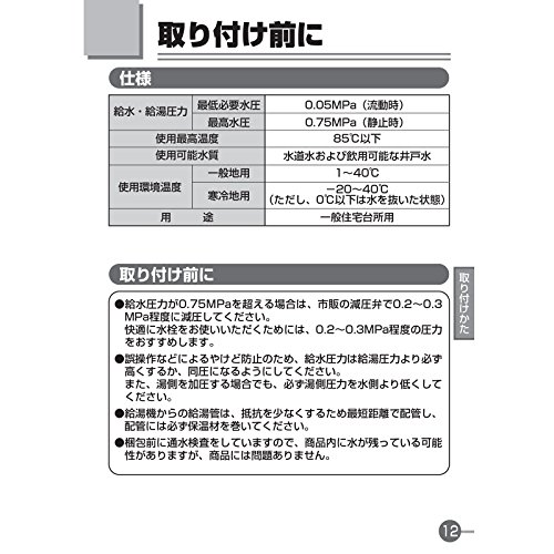 ●操作ハンドルも安心の金属メッキ製。●スタイリッシュなデザイン。●本体取付脚部で湯水の流量を調整可能。●ウォーターハンマー音低減。●ウォータージャケット機構搭載のため本体を触っても熱くない(本体内部のお湯側の通路を水の通路で覆っています)。【注意事項】【ご購入前に】・水栓に使用できる水質は、水道水および飲用可能な井戸水です。・水栓の最高使用圧力は0.75MPa(静止時)です。快適に水栓をご使用いただくためには、0.2~0.3MPa程度の圧力をおすすめします。・最低使用水圧(流動時)は0.05MPa以上。・取り付けサービスは行っていません。お客様ご自身でお取り付けお願いします。