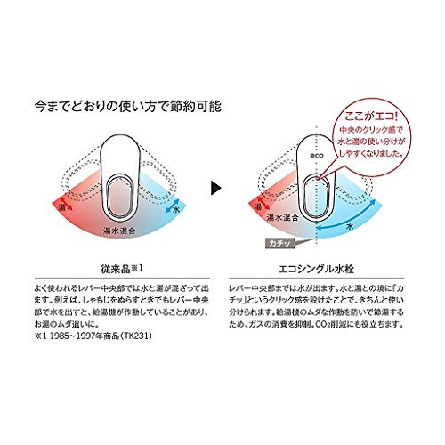 - エコシングル水栓:よく使用するレバー中央部でも水のみ吐水、また水と湯の境をクリック感で知らせ、無意識の湯の無駄遣いを防止する節湯機能付き水栓。