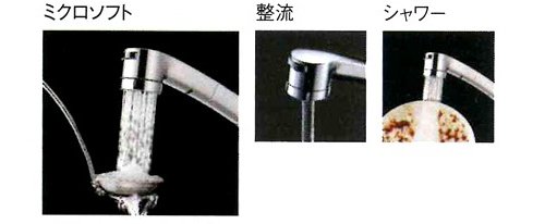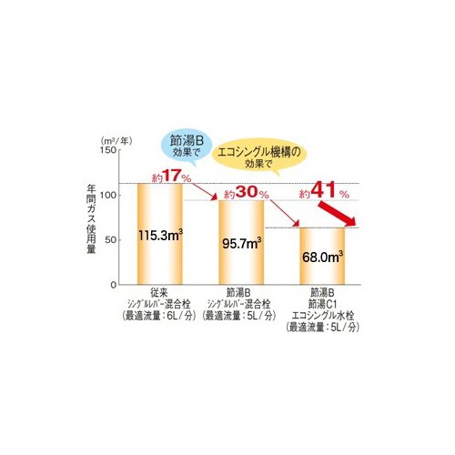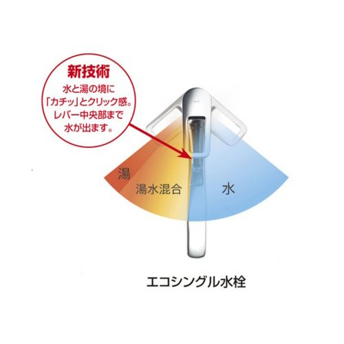 - エコシングル水栓:よく使用するレバー中央部でも水のみ吐水、また水と湯の境をクリック感で知らせ、無意識の湯の無駄遣いを防止する節湯機能付き水栓。