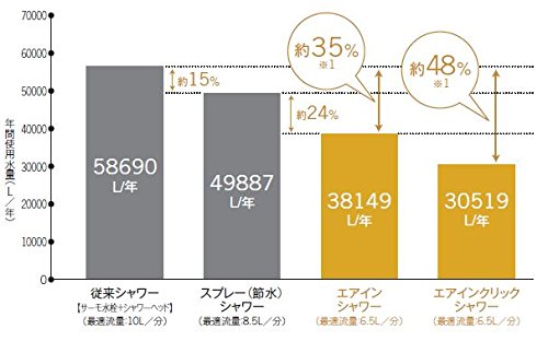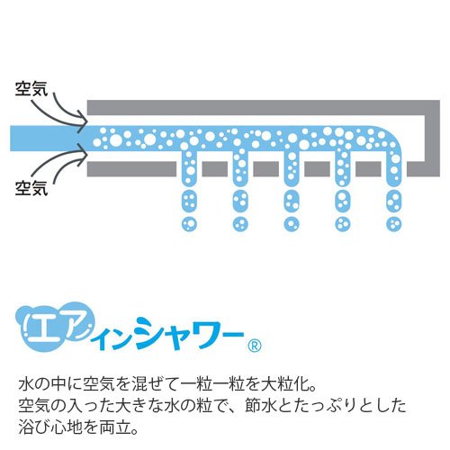 - エアインシャワー(めっき角型):水に空気を含ませることで、水の粒を大粒化。やさしい浴び心地はそのままに大幅節水。スタイリッシュな高品質めっき仕上げ、デザイン性の高い角型タイプ。