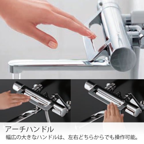 - アーチハンドル:横幅が広いので、指先でも手の甲でも目を閉じていても吐水・止水が簡単。また、左右どちらからでも操作可能なので、浴槽、洗い場どちらからも使いやすい。