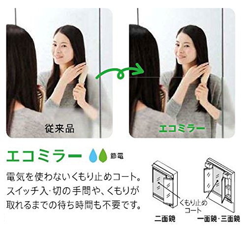 - 3面鏡:鏡裏は全て収納。合わせ鏡として使える便利なタイプ。ヒーターなしでもくもらないエコミラー付き。