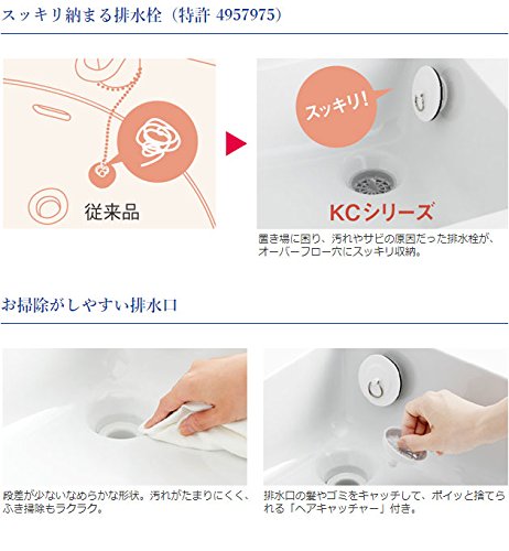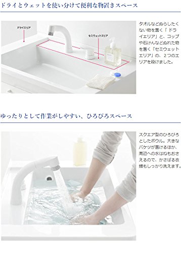 - ひろびろとしたスクエア形状のボウル。傾斜付きで泡やゴミがボウル面にたまりにくい設計。側面にすっきり納まる排水栓で見た目もすっきり。