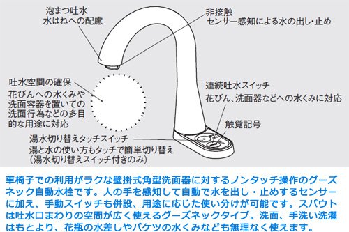 洗面器まわりが汚れにくく、水の止め忘れも防げる衛生的で経済的な水栓です。