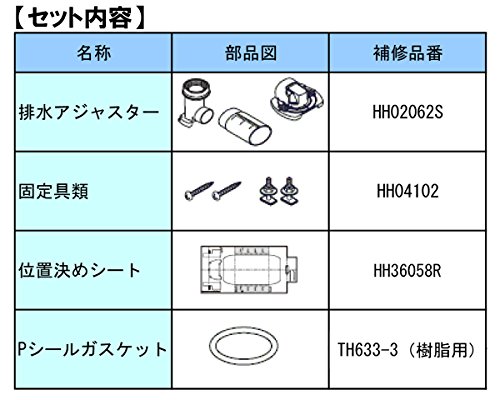 - ・【セット内容】:排水アジャスター(HH02062S)、固定具類(HH04102)、位置決めシート(HH36058R)、Pシールガスケット(TH633-3)