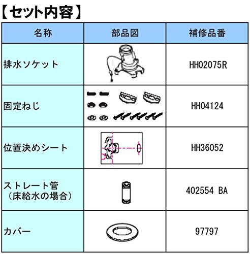 - ・【セット内容】:排水ソケット(HH02075R)、固定具類(HH04124)、位置決めシート(HH36052)、ストレート管(TH402554)、カバー(TH97797)