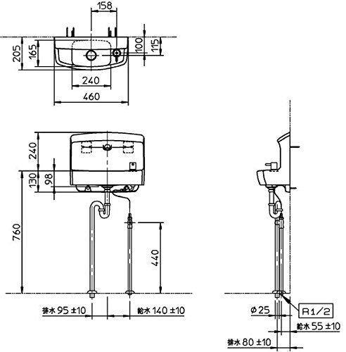 コンパクト手洗器 ハンドル式単水栓 床給水・床排水 手洗い器・セット金具一式(Sトラップ)